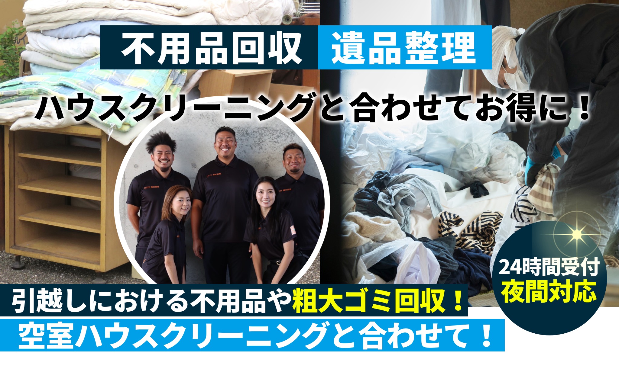 大阪・奈良・和歌山などの家電や家具等不用品や粗大ゴミ1品から何でも回収・処分を承ります。不用品回収や粗大ゴミの回収・引き取り・片付け代行はお任せ! 最短即日の不用品回収・粗大ゴミの処分可能。 引越し時の不用品や粗大ゴミをまとめて回収・引き取り・片付けを致します。また不動産管理物件のお部屋の残置物回収や撤去作業も可能です。即日の不用品回収も可能。空室清掃・ハウスクリーニングとセットもOK!