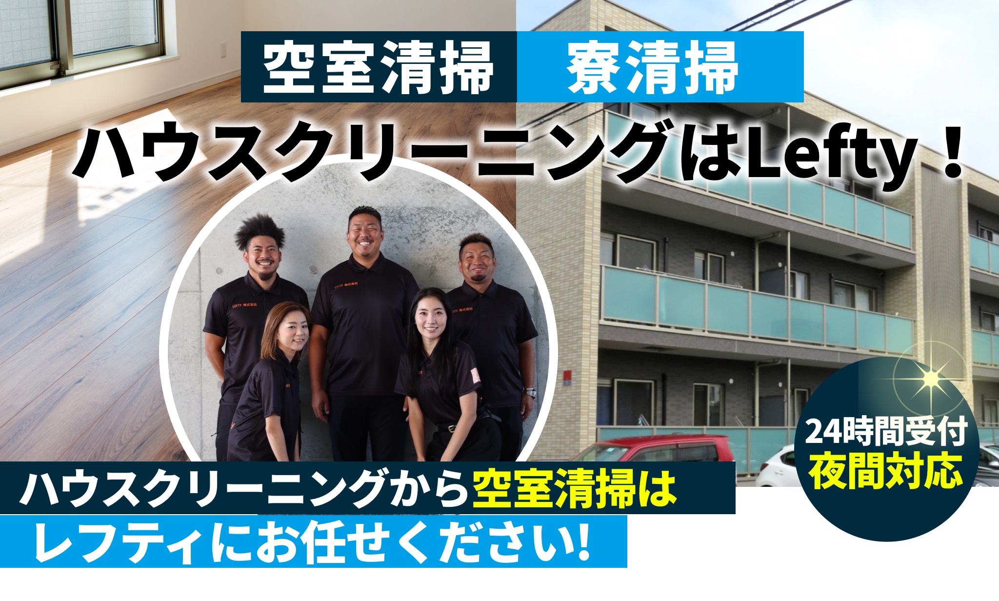 空室清掃や寮清掃などのハウスクリーニングなどのお悩みはレフティで解決!在宅のハウスクリーニングや引越し前後のハウスクリーニングやお掃除など、ハウスクリーニングのエキスパート集団レフティに全てお任せ!