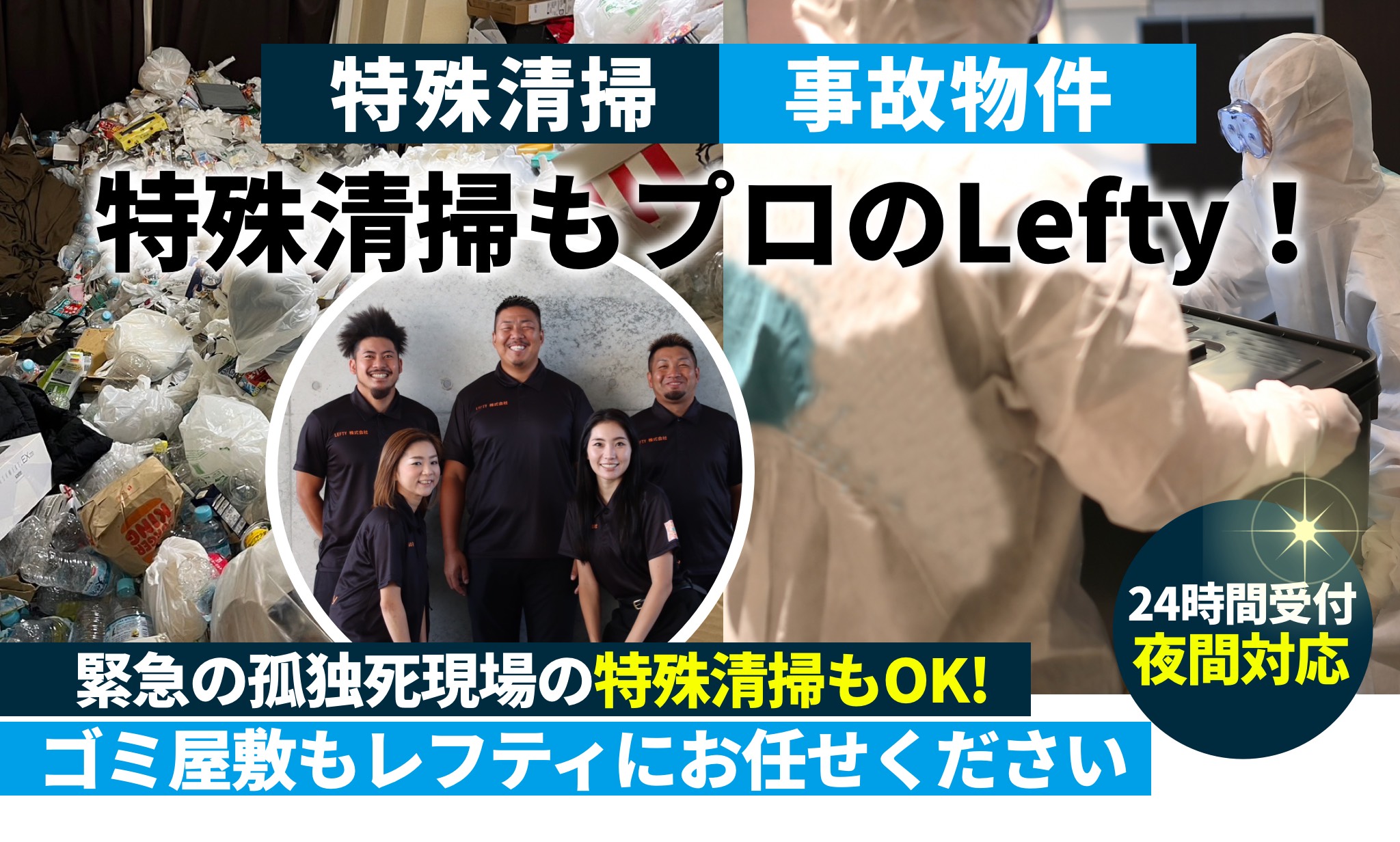 特殊清掃や汚物、ゴミ屋敷や汚部屋などのお悩みはレフティで解決!特殊清掃や消臭、ハウスクリーニングやお掃除など、ハウスクリーニングのエキスパート集団レフティに全てお任せ!
